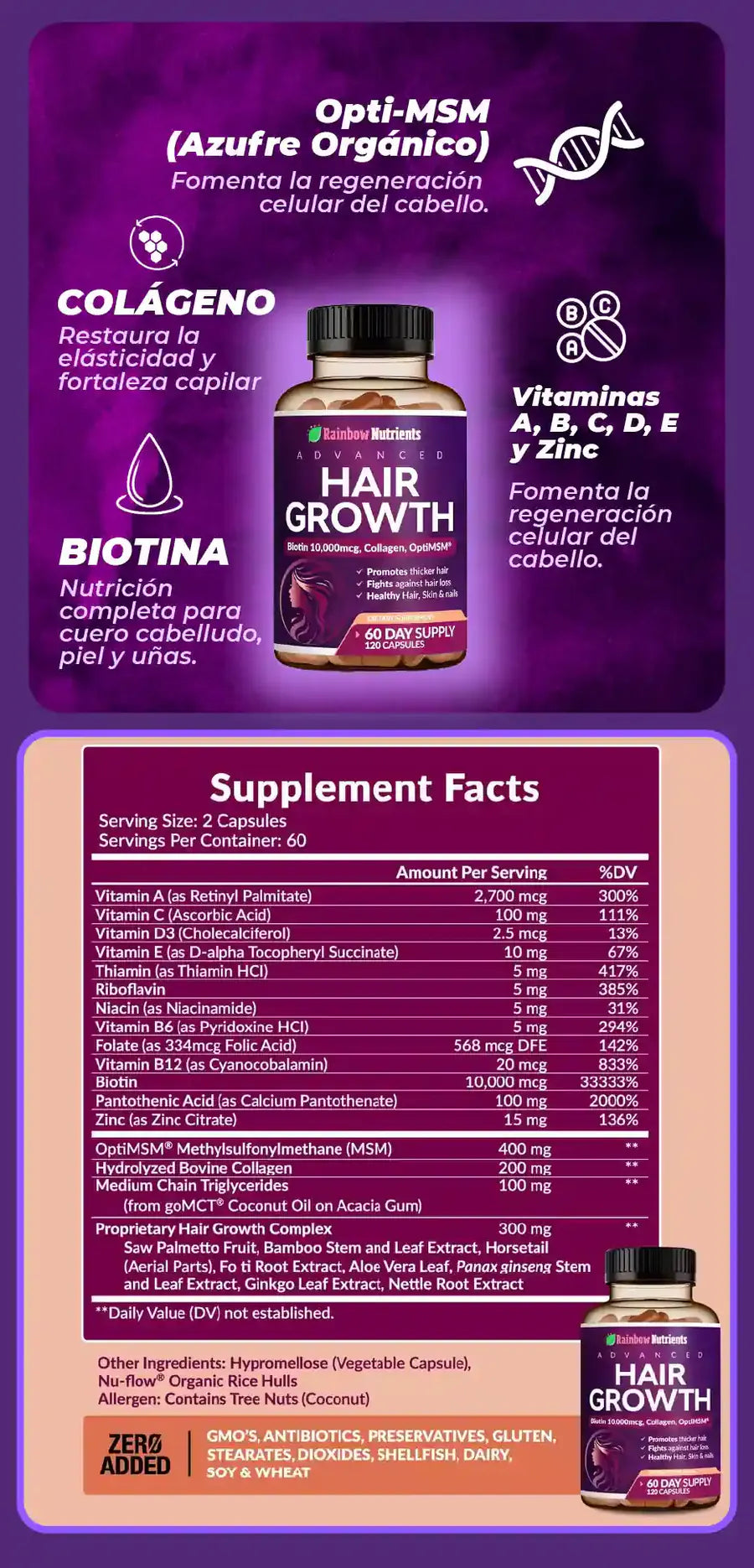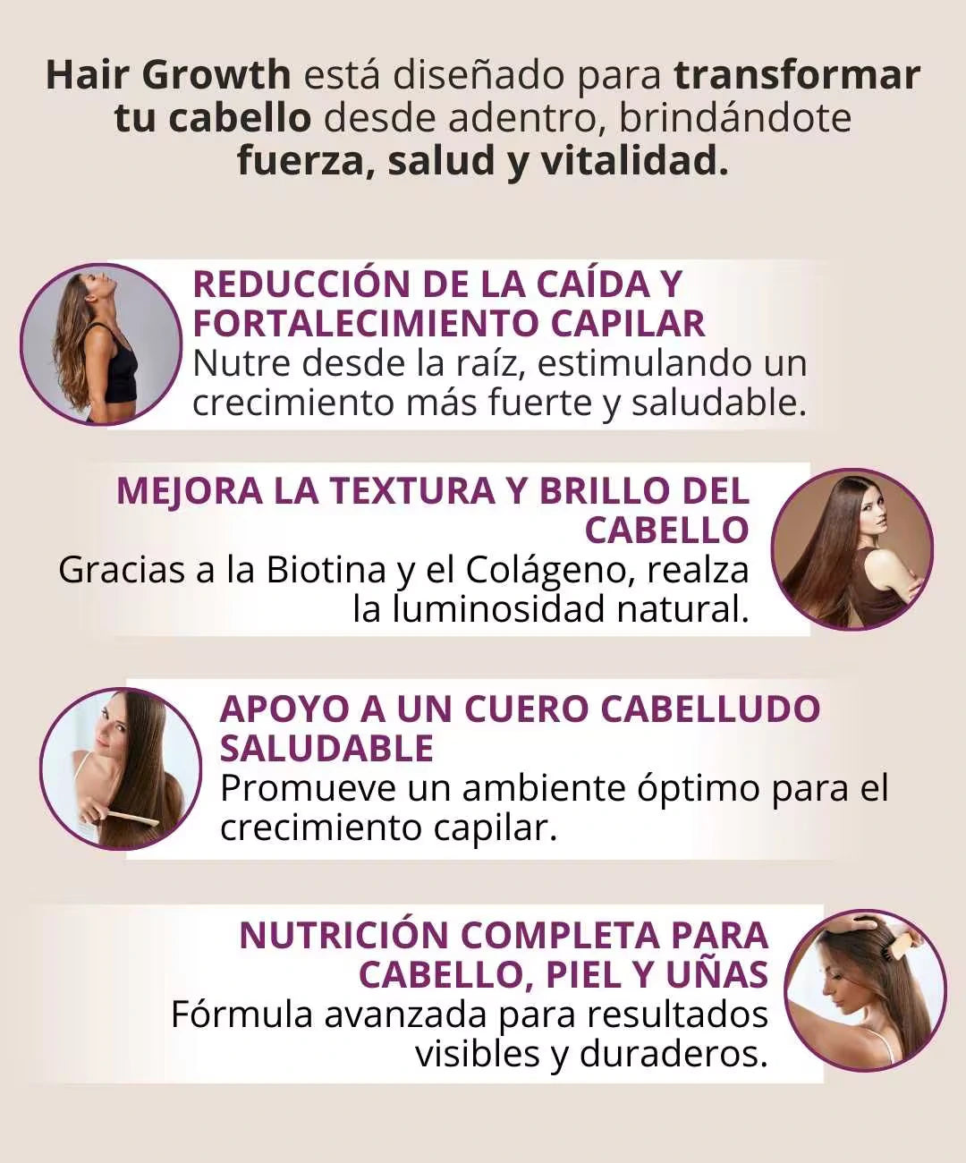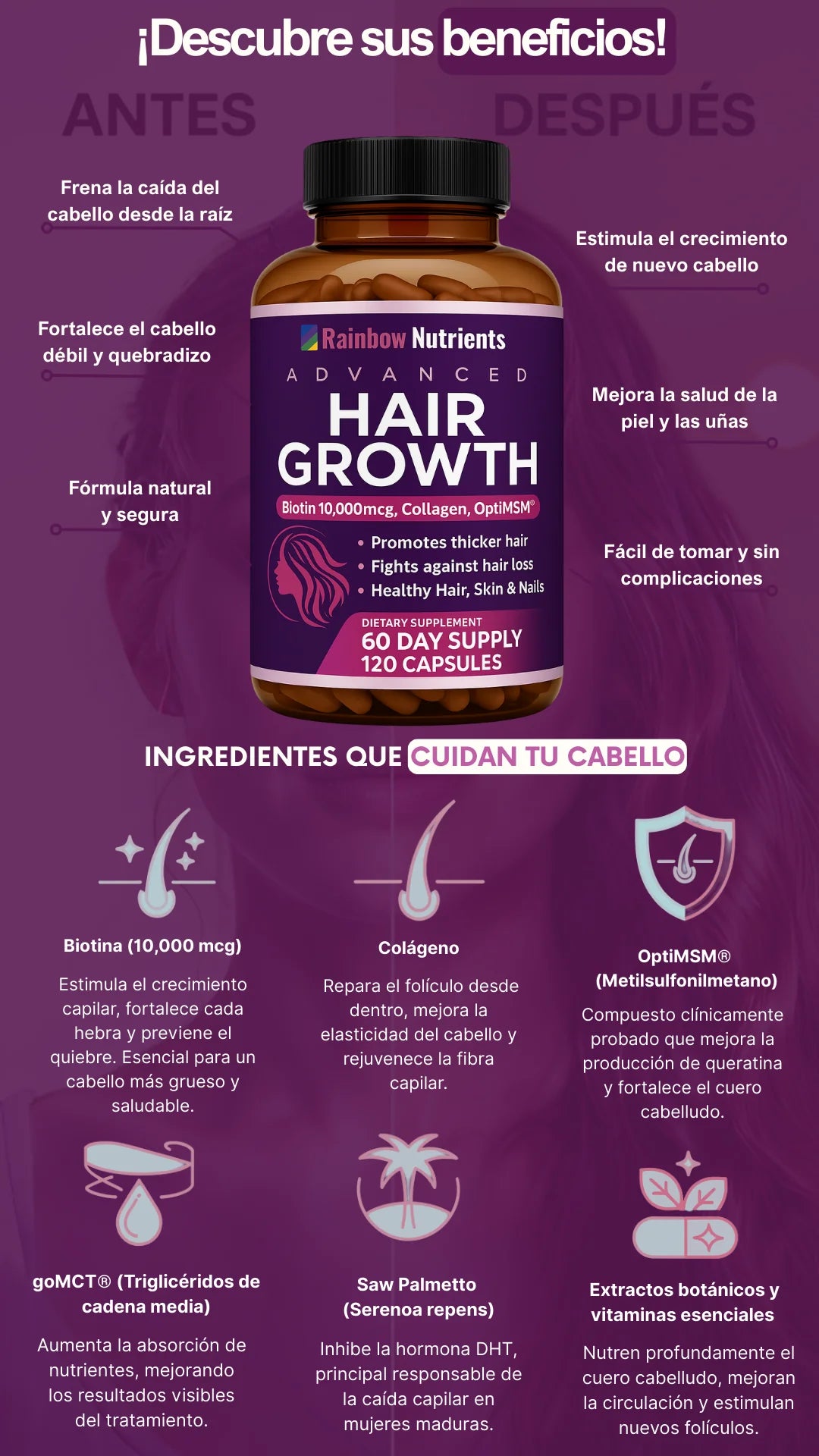 Contiene 10,000 mcg de biotina, colágeno y vitaminas esenciales para restaurar el brillo y vitalidad que tu cabello y piel necesitan.