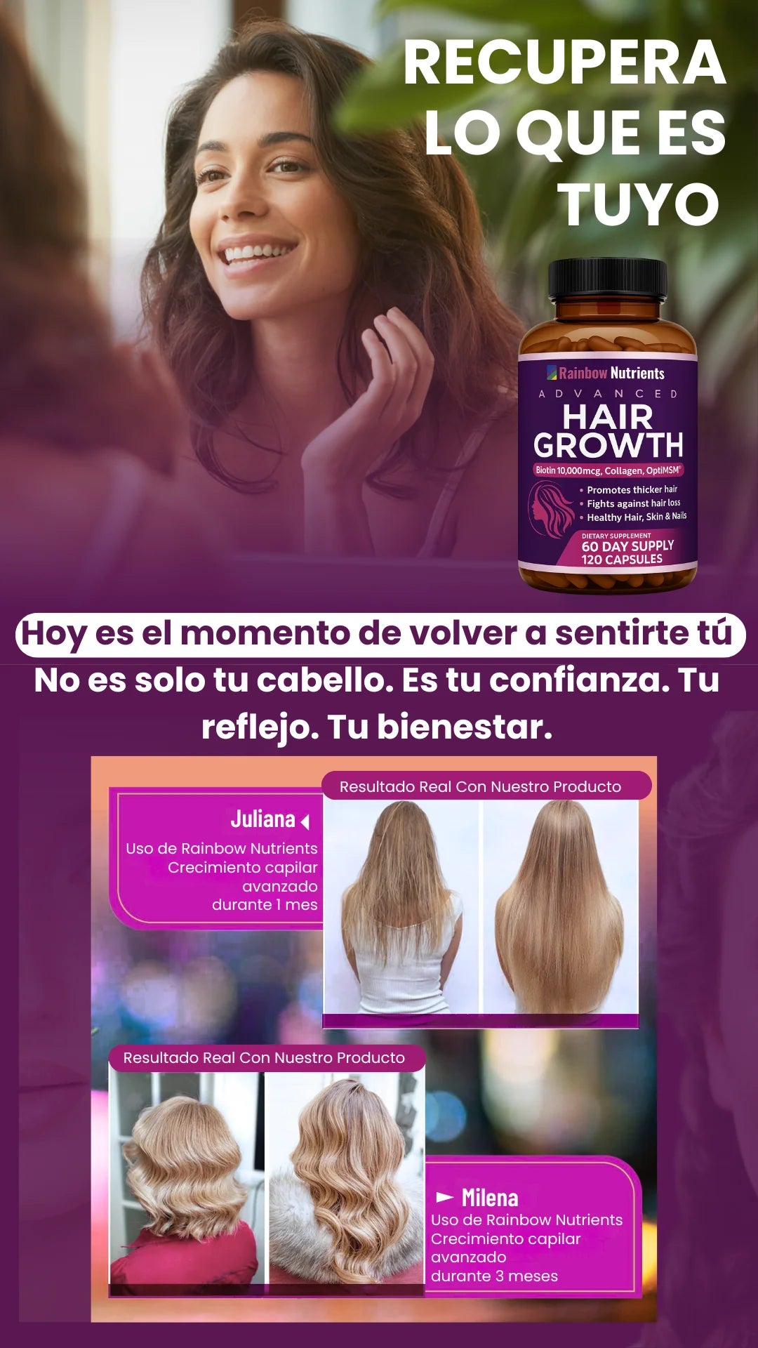 La mayoría de las usuarias notan menos caída en 4–8 semanas. El nuevo crecimiento visible típicamente aparece alrededor del mes 2, con una mejora significativa en grosor y volumen para el mes 3.